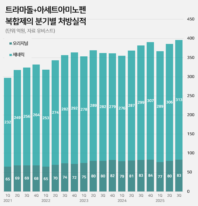 ±¹³» Æ®¶ó¸¶µ¹+¾Æ¼¼Æ®¾Æ¹Ì³ëÆæ º¹ÇÕÁ¦´Â Áߵ¡¤ÁßÁõ ÅëÁõ Ä¡·á ½ÃÀå¿¡¼­ ¸Å³â ¿Ï¸¸ÇÑ ¼ºÀåÀ» °ÅµìÇϰí ÀÖ´Ù. 2020³â 1207¾ï¿ø¿¡¼­ 2021³â 1271¾ï¿ø, 2022³â 1382¾ï¿ø, 2023³â 1446¾ï¿ø, Áö³­ÇØ 1496¾ï¿ø µîÀ¸·Î ÃÖ±Ù 4³â »õ 24% Áõ°¡Çß´Ù. ¿ÃÇØ´Â 3ºÐ±â ´©Àû 1149¾ï¿øÀ» ±â·ÏÇß´Ù.