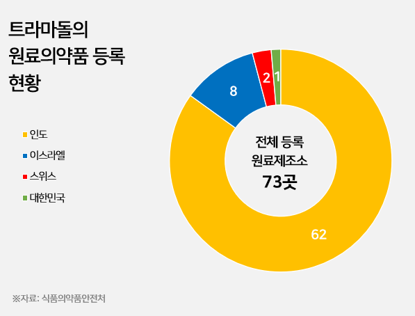 ½ÇÁ¦·Î Æ®¶ó¸¶µ¹ °ü·Ã ¿ø·áÀǾàǰ µî·Ï(DMF) ÇöȲÀ» º¸¸é, µî·ÏµÈ 73°³ ¿ø·áÁ¦Á¶¼Ò °¡¿îµ¥ 62°÷(85%)ÀÌ Àεµ¿¡ À§Ä¡ÇØÀÖ´Ù. ³ª¸ÓÁö 11°÷ Áß À̽º¶ó¿¤ÀÌ 8°÷(11%), ½ºÀ§½º 2°÷(3%), Çѱ¹ 1°÷(1%) µîÀÌ´Ù. ±¹³» °ø±Þ Á¦Ç° Áß »ó´ç¼ö°¡ Àεµ»ê ¿ø·á¿¡ ÀÇÁ¸ÇÏ´Â °ÍÀ¸·Î ÃßÁ¤µÇ´Â ´ë¸ñÀÌ´Ù.