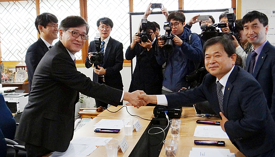 ¡ã ¾Ç¼ö¸¦ Çϰí ÀÖ´Â Á¤Áø¿± Àå°ü(¿ÞÂÊ)°ú ±èÇÊ°Ç È¸Àå.