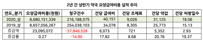 Áö³­ÇØ 1¿ùºÎÅÍ 6¿ù±îÁö Àü±¹ 2¸¸2312°³ ¾à±¹¿¡¼­ Áö±Þ ¹ÞÀº ¿ä¾ç±Þ¿©ºñ¿ëÀº 8Á¶6801¾ï¿øÀ¸·Î Àü³â µ¿±â ´ëºñ 0.27% Áõ°¡Çß´Ù.