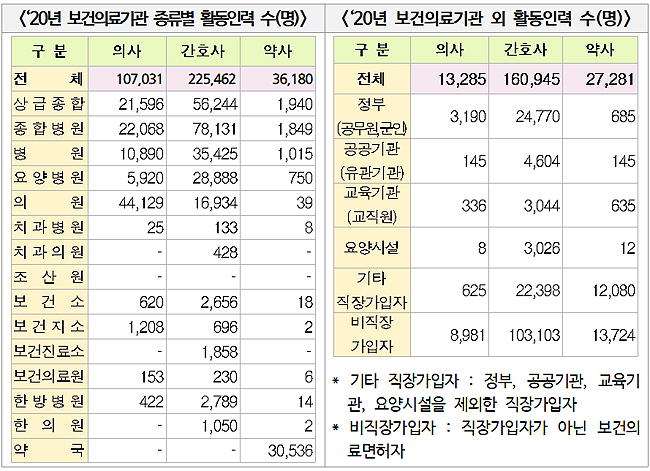 2020³âÀ» ±âÁØÀ¸·Î °Ç°­º¸Çè Á÷Àå°¡ÀÔÀÚ ÀڷḦ ±âÁØÀ¸·Î ÃßÁ¤ÇØ º¼ ¶§, ÀÇ»ç 1¸¸3285¸í, °£È£»ç 16¸¸945¸í, ¾à»ç 2¸¸7281¸íÀÌ º¸°ÇÀÇ·á±â°üÀÌ ¾Æ´Ñ °÷¿¡¼­ ÀÏÇÏ´Â °ÍÀ¸·Î ÃßÁ¤µÆ´Ù.