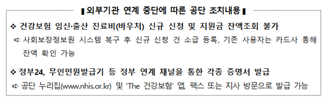 Á¤ºÎ ÇàÁ¤Á¤º¸°øµ¿ÀÌ¿ë¸ÁÀ» ÅëÇÑ Áֹεî·Ïº¯µ¿ÀÚ·á µî Á¤º¸¿¬°è Áß´ÜÀ¸·Î ÀÚ°Ý Ãëµæ¡¤º¯µ¿¡¤»ó½Ç µî °ø´Ü ¾÷¹« ÀϺοÍ, ¹«Àιοø¹ß±Þ±â µî ¿ÜºÎ±â°üÀ» ¿¬°èÇÑ Áõ¸í¼­ ¹ß±ÞÀÌ ÀϺΠÁß´Ü ¶Ç´Â Áö¿¬µÈ´Ù.