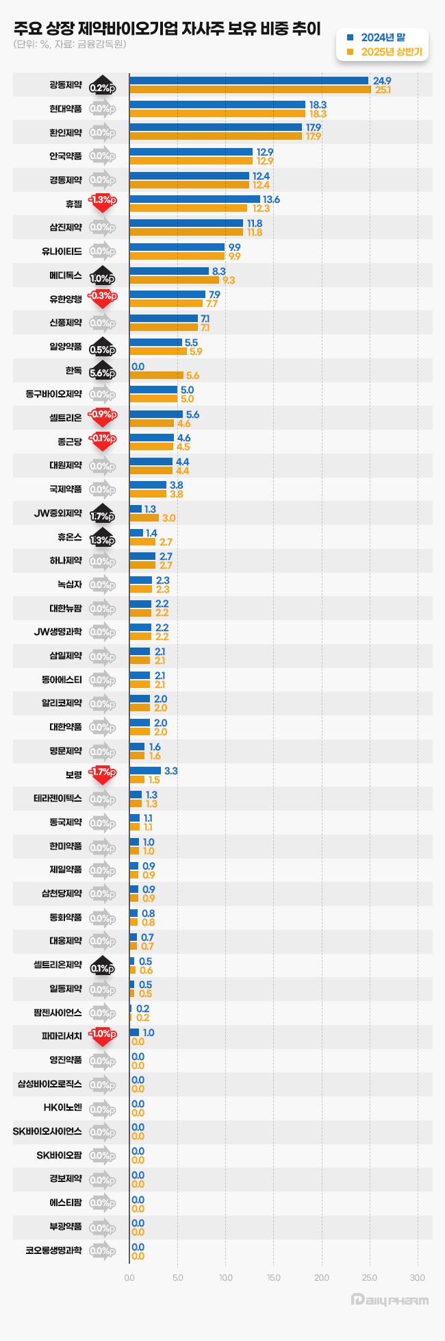 ±¤µ¿Á¦¾àÀº ÁÖ¿ä Á¦¾à¹ÙÀÌ¿À±â¾÷ Áß ÀÚ»çÁÖ ºñÁßÀÌ ³ôÀº ±â¾÷ Áß Çϳª´Ù. »ó¹Ý±â ¸» ±âÁØ ÁÖ¿ä Á¦¾à¹ÙÀÌ¿À±â¾÷ Áß ±¤µ¿Á¦¾àÀÌ °¡Àå ¸¹Àº 25.1%ÀÇ ÀÚ»çÁÖ¸¦ º¸À¯Çß´Ù. Çö´ë¾àǰ, ȯÀÎÁ¦¾à, ¾È±¹¾àǰ, °æµ¿Á¦¾à, ÈÞÁ©, »ïÁøÁ¦¾à µîÀº ÀÚ»çÁÖ º¸À¯ ºñÁßÀÌ 10%¸¦ »óȸÇß´Ù. ±¤µ¿Á¦¾àÀÇ À̹ø ÀÚ»çÁÖ Ã³ºÐÀ¸·Î º¸À¯ ºñÁßÀº 17.9%·Î ³·¾ÆÁ³Áö¸¸ ¿©ÀüÈ÷ ´Ù¸¥ ±â¾÷¿¡ ºñÇØ ³ôÀº ÆíÀÌ´Ù.