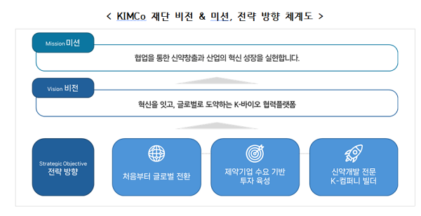 KIMCoÀç´ÜÀº Áö³­ 2020³â 8¿ù Çѱ¹Á¦¾à¹ÙÀÌ¿ÀÇùȸ¿Í ±¹³» Á¦¾à¹ÙÀÌ¿À±â¾÷ 59°÷ÀÌ 70¾ï¿øÀ» °øµ¿ ÃâÀÚÇØ ¼³¸³ÇÑ ºñ¿µ¸®Àç´ÜÀÌ´Ù. KIMCoÀç´ÜÀº °¨¿°º´ ´ëÀÀ°ú ¹Ì·¡ Çõ½Å½Å¾à °³¹ßÀ» À§ÇÑ ¿ÀÇ À̳뺣ÀÌ¼Ç Ç÷§Æû ±¸ÃàÀ» ¸ñÇ¥·Î Ãâ¹üÇß´Ù. Á¦¾à¹ÙÀÌ¿À»ê¾÷ÀÇ ±Û·Î¹ú½Å¾à °³¹ßÀ» À§ÇÑ °øµ¿ÅõÀÚ¿Í °øµ¿°³¹ßÀÇ Çù¾÷ Ç÷§Æû ±¸ÃàÀ» ¸ñÇ¥·Î ´Ù¾çÇÑ ¹Î°üÇù·ÂÆÄÆ®³Ê½ÊÀ» ÅëÇÑ »ê¾÷¹ßÀüÀ» Áö¿øÇÏ´Â ¿ªÇÒÀ» ÇÑ´Ù.