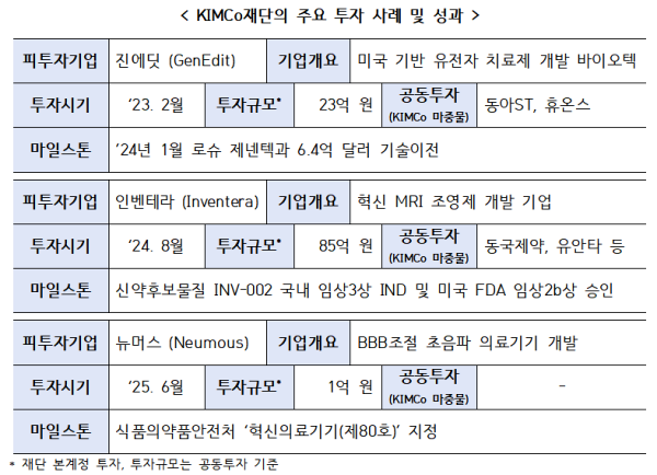 KIMCoÀç´ÜÀº 2023³â 2¿ù µ¿¾Æ¿¡½ºÆ¼, È޿½º¿Í ÇÔ²² ¹Ì±¹ ±â¹Ý À¯ÀüÀÚÄ¡·áÁ¦ °³¹ß ¹ÙÀÌ¿À±â¾÷ Áø¿¡µ÷¿¡ 23¾ï¿øÀ» ÅõÀÚÇß´Ù. Áö³­ÇØ 8¿ù¿¡´Â MRI Á¶¿µÁ¦ °³¹ß ±â¾÷ Àκ¥Å×¶ó¿¡ 85¾ï¿øÀÇ ÅõÀÚ¸¦ ¼º»ç½ÃÄ×´Ù. µ¿±¹Á¦¾à°ú À¯¾ÈŸ°¡ Àκ¥Å×¶ó ÅõÀÚ¿¡ Âü¿©Çß´Ù. Áö³­ 6¿ù¿¡´Â ÃÊÀ½ÆÄ ÀÇ·á±â±â ¾÷ü ´º¸Ó½º¿¡ 1¾ï¿øÀ» ÅõÀÚÇß´Ù.