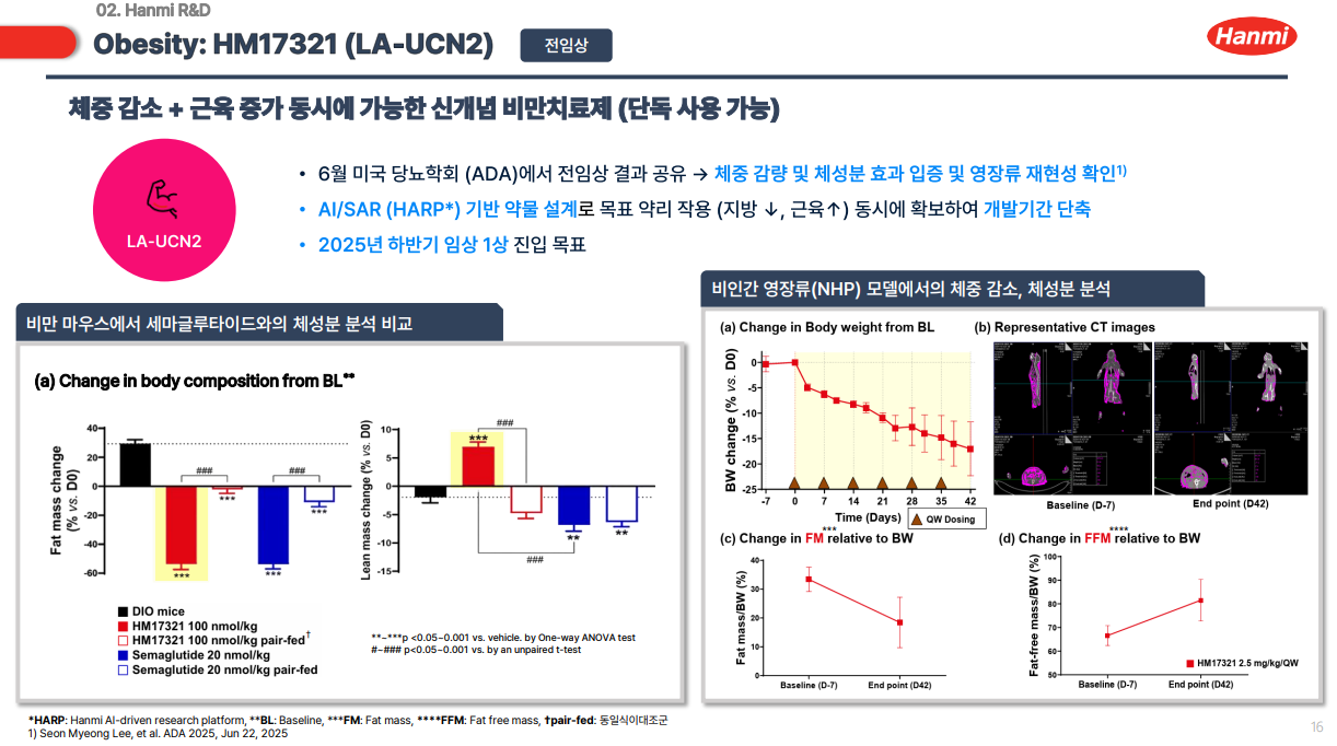 Çѹ̾àǰÀº üÁß °¨¼Ò¿Í ±ÙÀ° Áõ°¡¸¦ µ¿½Ã¿¡ ±¸ÇöÇÏ´Â ½Å°³³ä ºñ¸¸ Ä¡·áÁ¦ °³¹ß¿¡µµ ³ª¼¹´Ù. HM17321ÀÌ ±× ÁÖÀΰøÀÌ´Ù. Çѹ̾àǰÀº Áö³­´Þ ¹Ì±¹ ½ÄǰÀǾ౹(FDA)¿¡ HM17321 ÀÓ»ó 1»ó ÀÓ»ó½ÃÇè°èȹ(IND)À» ½ÅûÇß´Ù. °Ç°­ÇÑ ¼ºÀÎÀ» ´ë»óÀ¸·Î HM17321 ¾ÈÀü¼º°ú ³»¾à¼º, ¾àµ¿ÇÐ, ¾à·ÂÇРƯ¼º µîÀ» Æò°¡ÇÏ´Â ÀÓ»óÀÌ´Ù.