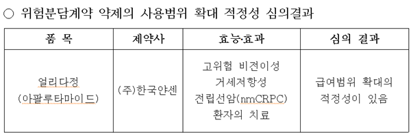 ¶Ç Çѱ¹¾á¼¾ÀÇ Àü¸³¼±¾ÏÄ¡·áÁ¦ ¡®¾ó¸®´ÙÁ¤¡¯Àº ±Þ¿©¹üÀ§°¡ È®´ëµÈ´Ù. ±âÁ¸ ±Þ¿© ±âÁØÀÎ ¡®È£¸£¸ó ¹ÝÀÀ¼º ÀüÀ̼º Àü¸³¼±¾Ï(mHSPC)¡¯¿¡ ¡®°íÀ§Çè ºñÀüÀ̼º °Å¼¼ÀúÇ×¼º Àü¸³¼±¾Ï(nmCRPC)¡¯ Ä¡·á°¡ Ãß°¡µÉ ¿¹Á¤ÀÌ´Ù.