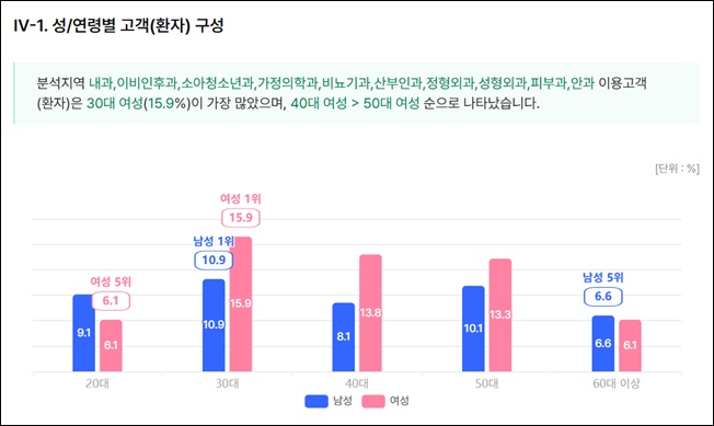 ÀÇ¿øÀÇ °æ¿ì 30´ë ¿©¼º °í°´ÀÇ ¹æ¹® ºñÁßÀÌ 15.9%·Î °¡Àå ¸¹¾Ò°í, 40´ë ¿©¼ºÀÌ 13.8%, 50´ë ¿©¼ºÀÌ 13.3%, 30´ë ³²¼º 10.9%, 50´ë ³²¼º 10.1%, 20´ë ³²¼º 9.1%, 40´ë ³²¼º 8.1%, 60´ë ÀÌ»ó ³²¼º 6.6%, 60´ë ÀÌ»ó ¿©¼º, 20´ë ÀÌ»ó ¿©¼ºÀÌ °¢ 6.1% ¼øÀ̾ú´Ù. Áö¿ª, ¹ÐÁý Áø·á°ú Ư¼º»ó ÀþÀºÃþ ¿©¼º °í°´ÀÇ ÀÇ¿ø ¹æ¹® ºñÁßÀÌ ³ôÀº °ÍÀ¸·Î µå·¯³µ´Ù.