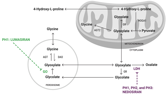 ÃÖ±Ù ÀÌ·¯ÇÑ º´Å»ý¸®¿¡ Âø¾ÈÇÏ¿© LDH isoenzymeÀÎ LDH-A¸¦ Á÷Á¢ ¾ïÁ¦ÇÏ´Â RNA °£¼·(RNAi) ±â¹Ý Ä¡·áÁ¦ÀÎ ³×µµ½Ã¶õ(Nedosiran)ÀÌ °³¹ßµÇ¾ú´Ù. ÀüÀÓ»ó ¿¬±¸¿Í ÀÓ»ó½ÃÇè¿¡¼­ ³×µµ½Ã¶õÀº Ç÷Áß ¹× ¿äÁß oxalate ¼öÄ¡¸¦ À¯ÀÇÇÏ°Ô °¨¼Ò½ÃŰ´Â È¿°ú¸¦ º¸¿©ÁÖ¾ú°í, ÀÌ´Â LDHA°¡ ´Ü¼øÈ÷ ÇØ´ç°úÁ¤(glycolysis)ÀÇ º¸Á¶ È¿¼Ò¿¡ ±×Ä¡´Â °ÍÀÌ ¾Æ´Ï¶ó PH1 Ä¡·á¿¡¼­ Çõ½ÅÀûÀ̰í À¯¸ÁÇÑ Å¸±êÀ¸·Î ±â´ÉÇÒ ¼ö ÀÖÀ½À» º¸¿©ÁØ´Ù.