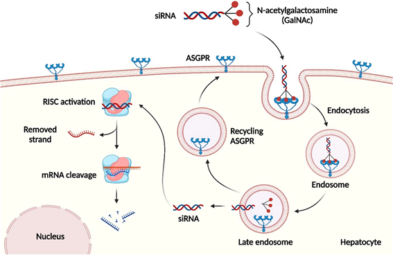 ³×µµ½Ã¶õÀº ÀÌÁß°¡´Ú siRNA·Î, GalNAc ¾Æ¹Ì³ë´ç Àܱ⿡ °áÇյǾî ÀÖ´Ù. ÇÇÇÏ ÁÖ»ç ÈÄ GalNAc-°áÇÕ ´çÀº ¾Æ½Ç·Î´ç´Ü¹é ¼ö¿ëü(ASGPR)¿¡ °áÇÕÇÏ¿© ³×µµ½Ã¶õÀ» °£¼¼Æ÷(hepatocyte)·Î Àü´ÞÇÑ´Ù. GalNAc-siRNA-ASGPR º¹ÇÕü´Â ¼¼Æ÷ ³»·Î À¯ÀÔµÇ¾î ¿£µµ¼Ø(endosome) ³»¿¡¼­ ºÐ¸®µÈ´Ù. ÀÌÈÄ siRNA´Â ¿£µµ¼ØÀ¸·ÎºÎÅÍ ¹æÃâµÇ°í, GalNAcÀº ºÐÇØµÇ¾î Á¦°ÅµÈ´Ù. ASGPRÀ» Æ÷ÇÔÇÑ ¼ÒÆ÷´Â ´Ù½Ã ¼¼Æ÷¸·°ú À¶ÇÕµÇ¾î °£¼¼Æ÷ Ç¥¸éÀ¸·Î µÇµ¹¾Æ°¡ ¼ö¿ëü ¼øÈ¯(recycling)À» ¸¶Ä£´Ù.