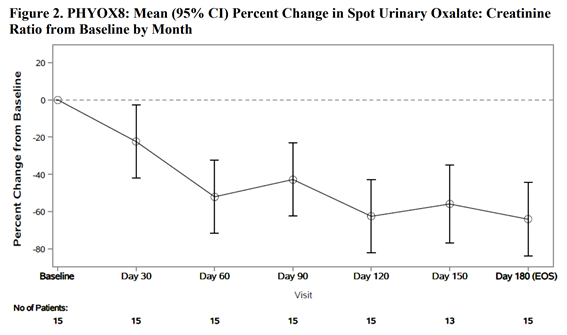 PHYOX8¿¡¼­ 6°³¿ù Ä¡·á¸¦ ¸¶Ä£ ȯÀÚµéÀº ÁøÇà ÁßÀÎ ´ÜÀϱº È®Àå ¿¬±¸ÀÎ PHYOX3¿¡ µî·ÏÇÒ ¼ö ÀÖ¾úÀ¸¸ç, Ãß°¡·Î 6°³¿ù°£ Ä¡·á¹ÞÀº 8¸íÀÇ È¯ÀÚ¿¡¼­ ¿ä ¿Á»ì»ê:Å©·¹¾ÆÆ¼´Ñ ºñÀ² °¨¼Ò È¿°ú°¡ À¯ÁöµÇ¾ú´Ù.