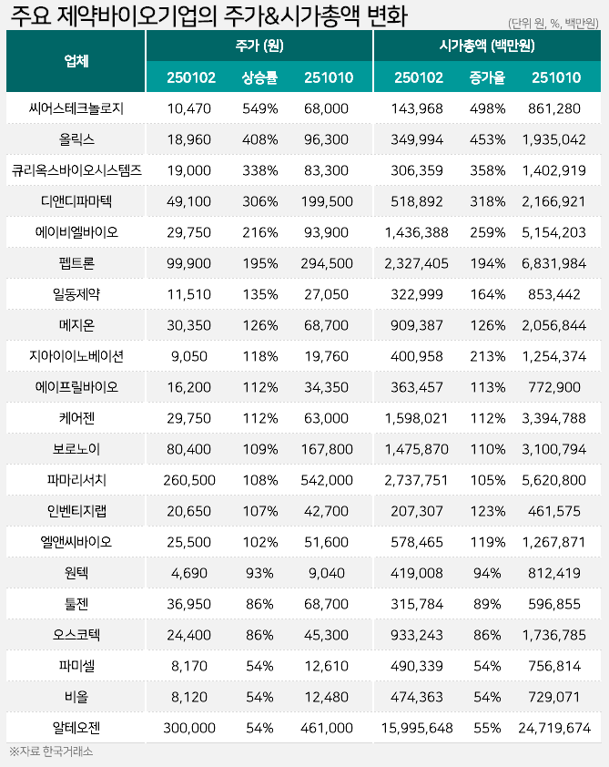 Á¦¾à¹ÙÀÌ¿À±â¾÷ ½ÃÃÑ 1À§ÀÎ »ï¼º¹ÙÀÌ¿À·ÎÁ÷½º´Â ¿¬ÃÊ 93¸¸4000¿ø¿¡¼­ 101¸¸4000¿øÀ¸·Î 8.6% »ó½ÂÇß´Ù. °°Àº ±â°£ ½ÃÃÑÀº 66Á¶4765¾ï¿ø¿¡¼­ 72Á¶993¾ï¿øÀ¸·Î Áõ°¡Çß´Ù. ½ÃÃÑ 2À§ ¼¿Æ®¸®¿ÂÀº ÁÖ°¡°¡ 18¸¸300¿ø¿¡¼­ 17¸¸3600¿øÀ¸·Î ¿ÀÈ÷·Á 3.7% Ç϶ôÇß´Ù. ´Ù¸¸ ÀÚ»çÁÖ ¼Ò°¢ µîÀÇ ¿µÇâÀ¸·Î ½Ã°¡ÃѾ×Àº 39Á¶1393¾ï¿ø¿¡¼­ 40Á¶1372¾ï¿øÀ¸·Î 2.5% ´Ã¾ú´Ù.