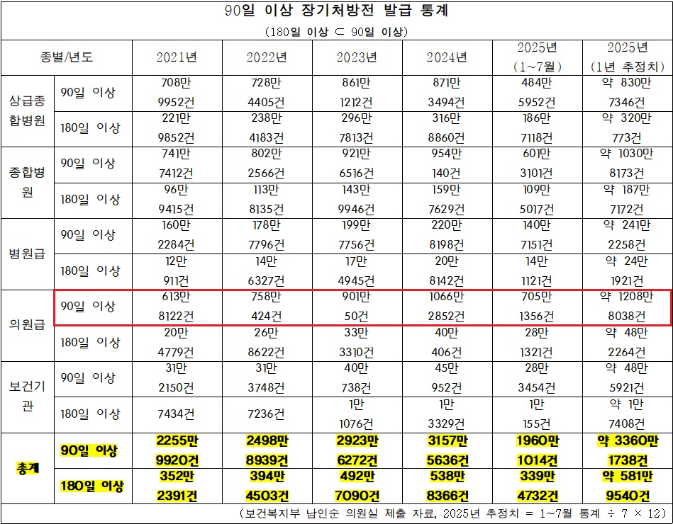 ¿ÃÇØ ¿ª½Ã 7¿ù±îÁö Åë°è¸¸ Áý°èÇØµµ 1960¸¸°ÇÀÌ ³Ñ´Â 90ÀÏ ÀÌ»ó Àå±â ó¹æÀüÀÌ ¹ß±ÞµÆ´Ù. ¿Ã ÇÑÇØ Ãß»ê ¹ß±Þ °Ç¼ö´Â ¾à 3360¸¸°ÇÀÌ´Ù.
