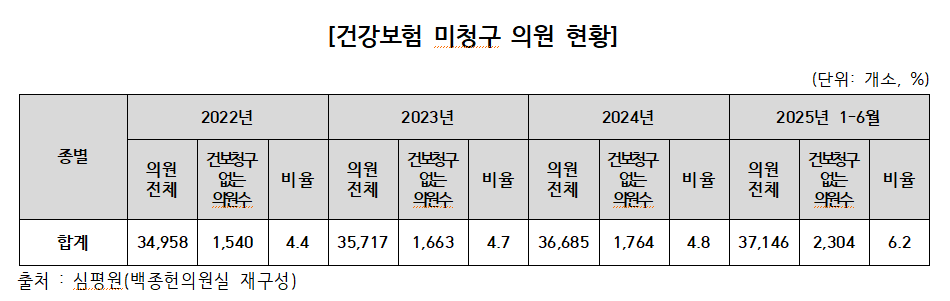 13ÀÏ ¹éÁ¾Çå ±¹¹ÎÀÇÈû ÀÇ¿øÀÌ °Ç°­º¸Çè½É»çÆò°¡¿øÀ¸·ÎºÎÅÍ Á¦Ãâ ¹ÞÀº ÀÚ·á¿¡ µû¸£¸é, ¿ÃÇØ »ó¹Ý±â ±âÁØ °Ç°­º¸Çè Áø·áºñ û±¸°¡ ´Ü ÇÑ °Çµµ ¾ø´Â ÀÇ¿ø±Þ ÀÇ·á±â°üÀÌ 2304°÷À̾ú´Ù. 2022³â¿¡´Â 1540°÷À¸·Î 3³â »çÀÌ ¾à 50%°¡ ´Ã¾ú´Ù.