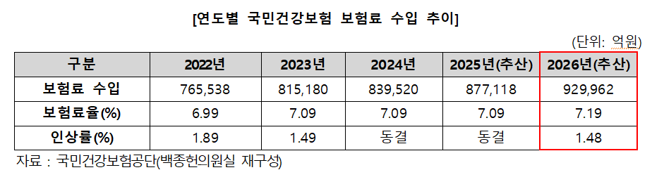13ÀÏ ¹éÁ¾Çå ±¹¹ÎÀÇÈû ÀÇ¿øÀÌ ±¹¹Î°Ç°­º¸Çè°ø´ÜÀ¸·ÎºÎÅÍ Á¦Ãâ¹ÞÀº ÀÚ·á¿¡ µû¸£¸é, ³»³â °Ç°­º¸Çè·áÀ²Àº ¿ÃÇØ 7.09%¿¡¼­ ³»³â 7.19%·Î 1.48% ÀλóµÈ´Ù. ¼öÀÔ¾×Àº 87Á¶ 7118¾ï¿ø¿¡¼­ 92Á¶ 9962¾ï¿øÀ¸·Î 5Á¶ 2844¾ï¿øÀÌ Áõ°¡ÇÑ´Ù.