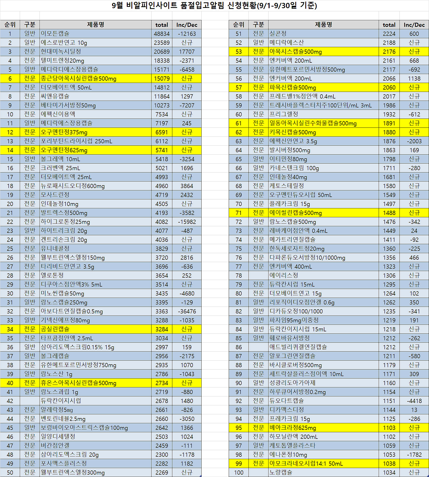 ¿À±¸¸àƾÁ¤375mg°ú ¿À±¸¸àƾÁ¤650mgµµ 6591ȸ, 5741ȸ·Î 12À§¿Í 14À§¿¡ ¿Ã¶ú´Ù. º£¾ÆÅ©¶óÁ¤625mg°ú ¾Æ¸ðÅ©¶ó³×¿À½Ã·´ ¿ª½Ã 95À§¿Í 99À§·Î ¼øÀ§±ÇÀ» Â÷ÁöÇß´Ù.