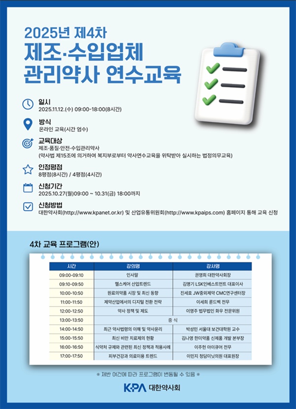 [µ¥Àϸ®ÆÊ=±èÁöÀº ±âÀÚ] ´ëÇѾà»çȸ(ȸÀå ±Ç¿µÈñ) »ê¾÷À¯ÅëÀ§¿øÈ¸(À§¿øÀå ±Ç¿µÀÌ)´Â ¿À´Â 11¿ù 12ÀÏ ¿ÃÇØ ¸¶Áö¸· ¡®2025³âµµ Á¦4Â÷ ÀǾàǰ Á¦Á¶¡¤¼öÀÔ¾÷ü °ü¸®¾à»ç ¿Â¶óÀÎ ¿¬¼ö±³À°¡¯À» ÁøÇàÇÑ´Ù°í ¹àÇû´Ù.