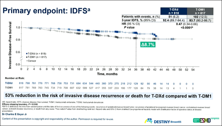 ¹ßÇ¥¸¦ ¸ÃÀº Âû½º °ÔÀ̾î(Charles E. Geyer) ¹Ì±¹ ÇÇÃ÷¹ö±×´ë/UPMC Èú¸Õ¾Ï¼¾ÅÍ ±³¼ö´Â "Àç¹ß À§ÇèÀÌ ³ôÀº °íÀ§Çè ȯÀÚ¿¡¼­ T-DXd°¡ T-DM1º¸´Ù ¸íÈ®ÇÑ »ýÁ¸ ÀÌÁ¡À» º¸¿´´Ù"°í °­Á¶Çß´Ù.