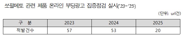 ±× °á°ú 2023³â 57°Ç, 2024³â 53°Ç, 2025³â 20°ÇÀÇ ºÎ´ç±¤°í¸¦ Àû¹ßÇß°í, ½îÆÈ¸ÞÅä ¿­¸Å ÃßÃâ¹° ±âÁØ‧±Ô°Ý °³¼± ½ÃÇà(¡¯24.1) ÈÄ °Ç±â½Ä ½îÆÈ¸ÞÅä ¿­¸Å ÃßÃâ¹° ¼öÀÔ¿ø·á ÃÑ 93°ÇÀ» °Ë»çÇÑ °á°ú 1°ÇÀÌ ºÎÀûÇÕÀ¸·Î È®ÀεƴÙ.
