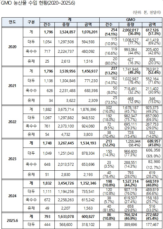 ½ÇÁ¦ ½ÄǰÀǾàǰ¾ÈÀüó°¡ ³²Àμø ÀÇ¿ø½Ç¿¡ Á¦ÃâÇÑ ¡®GMO ³ó»ê¹° ¼öÀÔÇöȲ¡¯À» º¸¸é, Áß·® ±âÁØ 2020³â 200¸¸Åæ¿¡¼­ 2021³â 174¸¸Åæ, 2022³â 168¸¸Åæ, 2023³â 126¸¸ÅæÀ¸·Î °¨¼ÒÇߴµ¥, Áö³­ÇØ 153¸¸ÅæÀ¸·Î ´Ù½Ã Áõ°¡Çß°í, ¿ÃÇØ »ó¹Ý±â¿¡¸¸ 77¸¸ÅæÀÌ ¼öÀÔµÈ °ÍÀ¸·Î Áý°èµÆ´Ù.