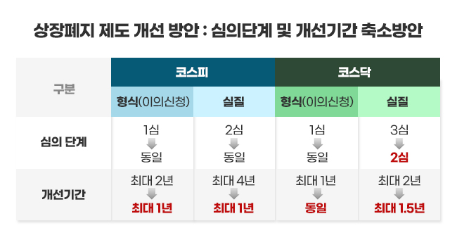 À̿ܿ¡µµ ±ÝÀ¶´ç±¹Àº °¨»çÀÇ°ß ¹Ì´Þ¿ä°Ç ±âÁØ °­È­, »óÀåÆóÁö ÀýÂ÷ È¿À²È­ µî »óÀåÆóÁö Á¦µµ °³¼± ¹æ¾ÈÀ¸·Î Á¦½ÃÇß´Ù. ÇöÇà Á¦µµ¿¡¼­´Â °¨»çÀÇ°ß ¹Ì´Þ ½Ã ´Ù´ÙÀ½ »ç¾÷¿¬µµ °¨»çÀǰßÀÌ ³ª¿Ã ¶§±îÁö °³¼±±â°£À» ºÎ¿©Çϴµ¥, ¾ÕÀ¸·Î´Â 2ȸ ¿¬¼Ó °¨»çÀÇ°ß ¹Ì´Þ ½Ã Áï½Ã »óÀåÆóÁöµÈ´Ù. »óÀåÆóÁö ½ÉÀÇ ´Ü°è¿Í ±â¾÷¿¡ ºÎ¿©ÇÏ´Â °³¼±±â°£µµ Ãà¼ÒÇÑ´Ù. ÄÚ½º´ÚÀº ½ÉÀÇ ´Ü°è¸¦ 3½ÉÁ¦¿¡¼­ 2½ÉÁ¦·Î, ÃÖ´ë °³¼± ±â°£À» 2³â¿¡¼­ 1³â 6°³¿ù·Î ÁÙÀδÙ.