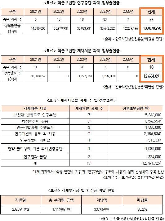 22ÀÏ ÀÌÁÖ¿µ °³Çõ½Å´ç ±¹È¸ÀÇ¿ø(º¸°Çº¹ÁöÀ§¿øÈ¸¡¤ºñ·Ê´ëÇ¥)ÀÌ Çѱ¹º¸°Ç»ê¾÷ÁøÈï¿ø(ÀÌÇÏ ÁøÈï¿ø)À¸·ÎºÎÅÍ Á¦Ãâ¹ÞÀº ÀÚ·á¿¡ µû¸£¸é ÁøÈï¿øÀÌ Áö¿øÇÑ R&D °úÁ¦ Áß ÃÖ±Ù 5³â°£ Áß´ÜµÈ ¿¬±¸°úÁ¦ 77°³¿¡ Áö±ÞµÈ Á¤ºÎÃ⿬±ÝÀº 1300¾ï¿ø, Á¦ÀçóºÐÀ» ¹ÞÀº 18°³ÀÇ Á¤ºÎÃ⿬±ÝÀº 126¾ï¿øÀ̾ú´Ù.