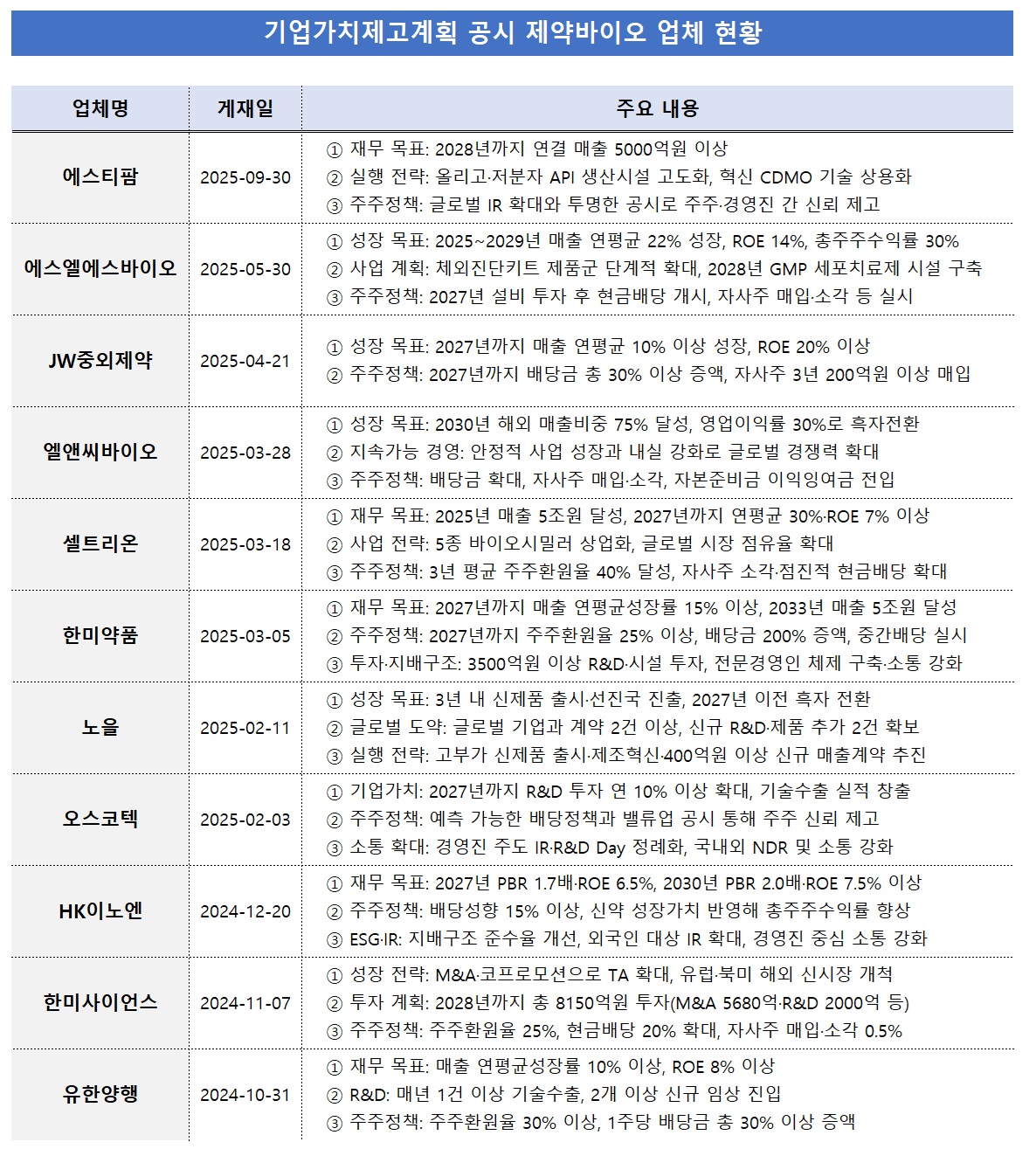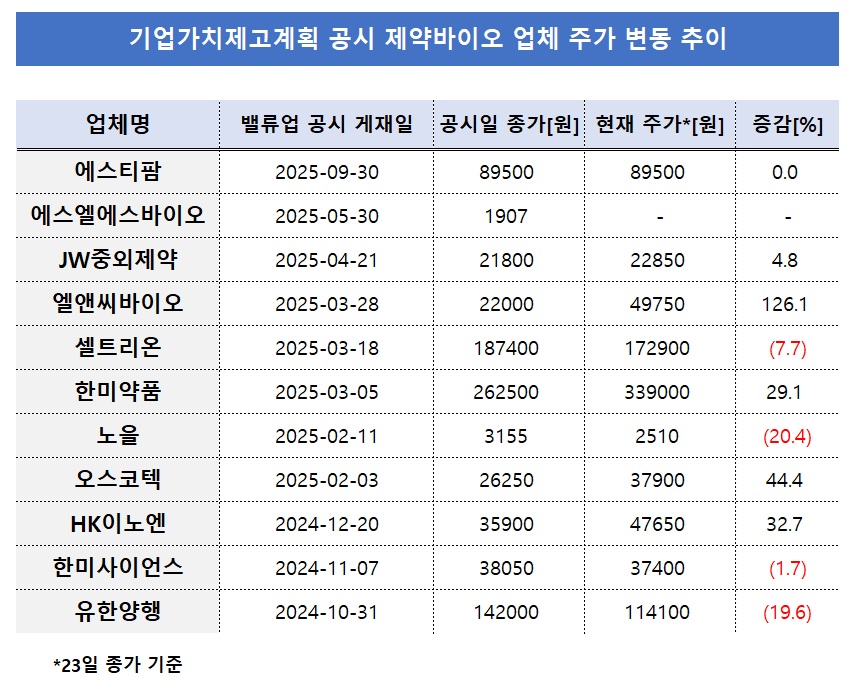 25ÀÏ ±ÝÀ¶°¨µ¶¿ø¿¡ µû¸£¸é À̳¯±îÁö ±â¾÷°¡Ä¡ Á¦°í °èȹÀ» °ø½ÃÇÑ »óÀå Á¦¾à¹ÙÀÌ¿À¡¤ÇコÄÉ¾î ±â¾÷Àº 11°÷À¸·Î Áý°èµÆ´Ù. ¿¡½ºÆ¼ÆÊ, HKÀ̳뿣, JWÁß¿ÜÁ¦¾à, ³ëÀ», ¼¿Æ®¸®¿Â, ¿¡½º¿¤¿¡½º¹ÙÀÌ¿À, ¿¤¾Ø¾¾¹ÙÀÌ¿À, ¿À½ºÄÚÅØ, À¯ÇѾçÇà, Çѹ̻çÀ̾ð½º, Çѹ̾àǰ µîÀÌ ÇØ´çÇÑ´Ù.