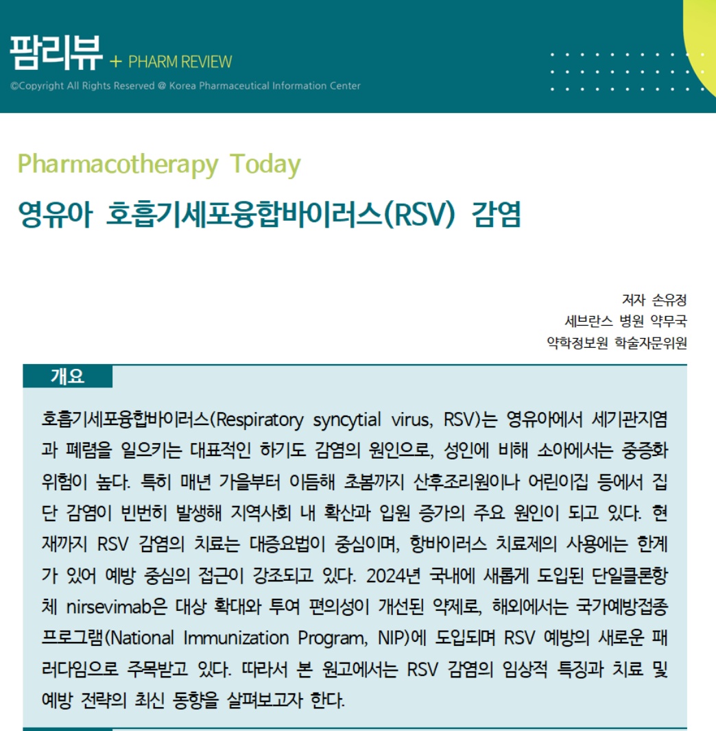 ¼ÕÀ¯Á¤ ¾àÁ¤¿ø ÇмúÀÚ¹®À§¿ø(¼¼ºê¶õ½ºº´¿ø ¾à¹«±¹)ÀÌ ÀÛ¼ºÇÑ À̹ø ±ÛÀº ¸Å³â °¡À»ºÎÅÍ À̵ëÇØ Ãʺ½±îÁö À¯ÇàÇÏ´Â RSV °¨¿°ÀÇ ÀÓ»óÀû Ư¡°ú ´õºÒ¾î Ä¡·á, ¿¹¹æ Àü·«ÀÇ Ãֽе¿ÇâÀ» Á¦½ÃÇß´Ù.