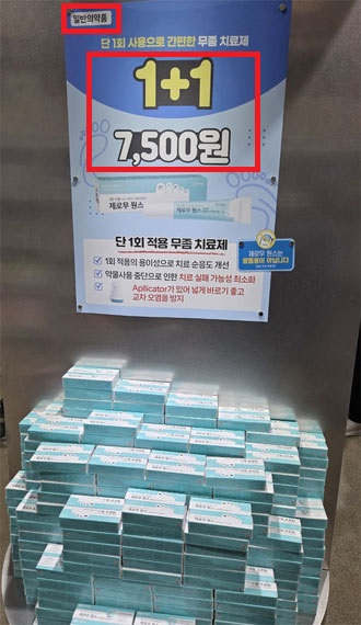 Æ÷½ºÅÍ¿¡´Â '´Ü 1ȸ »ç¿ëÀ¸·Î °£ÆíÇÑ ¹«Á» Ä¡·áÁ¦ 1+1'À̶ó´Â ¹®±¸¿Í ÇÔ²² 'ÀϹÝÀǾàǰ'ÀÌ Ç¥±âµÅ ÀÖ´Ù. Á¦Ç°Àº 2°³¾¿ ¹­¿© 7500¿ø¿¡ ÆÇ¸ÅµÇ°í ÀÖ¾ú´Ù.