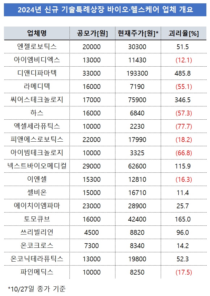¿ÃÇØ ±â¼úƯ·Ê »óÀå ¹ÙÀÌ¿À¡¤ÇコÄÉ¾î ±â¾÷ÀÇ ÁÖ°¡ °­¼¼ È帧Àº Áö³­ÇØ¿Í ´ëÁ¶ÀûÀÌ´Ù. 2024³â ±â¼úƯ·Ê·Î ½Å±Ô »óÀåÇÑ ¹ÙÀÌ¿À¡¤ÇコÄÉ¾î ±â¾÷Àº ÃÑ 18°÷ÀÌ´Ù. ¿£Á©·Îº¸Æ½½º, ¾ÆÀÌ¿¥ºñµð¿¢½º, µð¾ØµðÆÄ¸¶ÅØ, ¶ó¸ÞµðÅØ, ¾¾¾î½ºÅ×Å©³î·ÎÁö, ÇϽº, ¿¢¼¿¼¼¶óǻƽ½º, ÇǾؿ¡½º¹Ìij´Ð½º, ¾ÆÀ̺öÅ×Å©³î·ÎÁö, ³Ø½ºÆ®¹ÙÀÌ¿À¸ÞµðÄÃ, ÀÌ¿£¼¿, ¼¿ºñ¿Â, ¿¡ÀÌÄ¡ÀÌ¿¥ÆÄ¸¶, Åä¸ðÅ¥ºê, ¾²¸®ºô¸®¾ð, ¿ÂÄÚÅ©·Î½º, ¿ÂÄÚ´ÐÅ×¶óǻƽ½º, ÆÄÀθ޵ñ½º µîÀÌ´Ù.