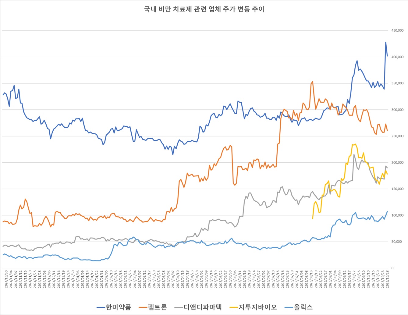 [µ¥Àϸ®ÆÊ=Â÷ÁöÇö ±âÀÚ] ±Û·çÄ«°ï À¯»ç ÆéŸÀ̵å-1(GLP-1) °è¿­ ºñ¸¸Ä¡·áÁ¦°¡ Àü ¼¼°èÀûÀ¸·Î °¢±¤¹Þ´Â °¡¿îµ¥ ±¹³»¿¡¼­µµ °ü·Ã ±â¼úÀ» º¸À¯ÇÑ ¹ÙÀÌ¿À ±â¾÷ ÁÖ°¡°¡ µé½âÀ̰í ÀÖ´Ù. ÀϺΠ±â¾÷Àº 1³â »õ ÁÖ°¡°¡ ³× ¹è ÀÌ»ó ±ÞµîÇÏ¸ç ½ÃÀåÀ» ÁÖµµÇÑ ¹Ý¸é ±â´ë°¨ÀÌ ½ÄÀ¸¸ç Á¶Á¤À» ¹ÞÀº °÷µµ ÀûÁö ¾Ê´Ù. ÀÓ»ó ÁøÀü ¼Óµµ¿Í ±â¼ú·Â¿¡ µû¶ó ±â¾÷º° ¿ÂµµÂ÷°¡ ¶Ñ·ÇÇØÁö´Â ºÐÀ§±â´Ù.