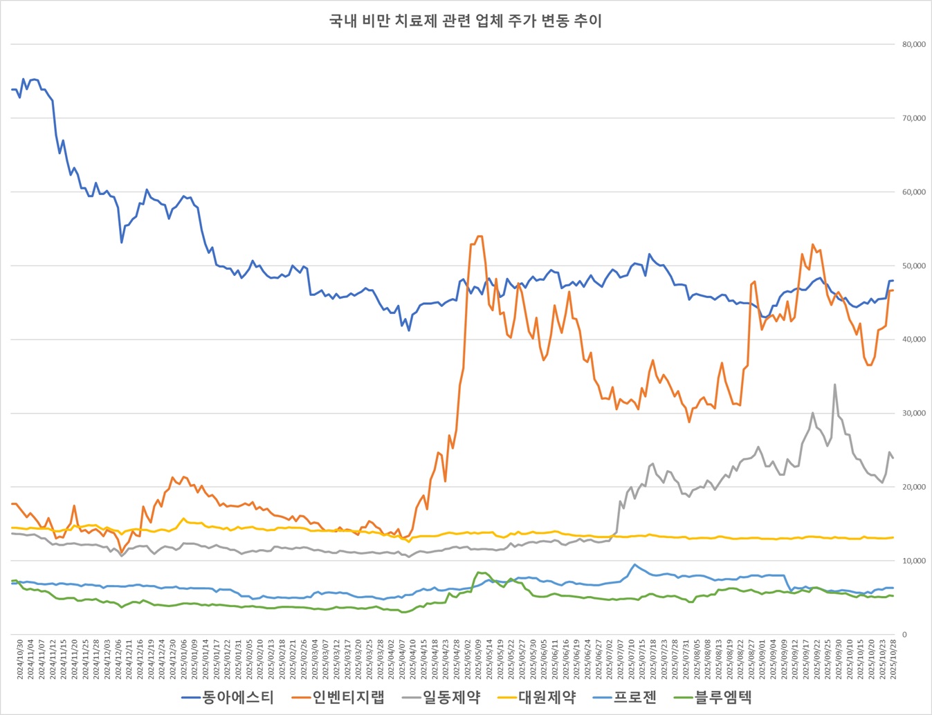 À§°íºñ ±¹³» À¯ÅëÀ» ´ã´çÇÑ´Ù´Â ¼Ò½ÄÀÌ ¾Ë·ÁÁö¸é¼­ ÇѶ§ ÁÖ°¡°¡ ±ÞµîÇß´ø ºí·ç¿¥ÅØÀº ÀÌÈÄ Á¶Á¤À» ¹Þ¾Ò´Ù. ÀÌ È¸»ç 28ÀÏ Á¾°¡´Â 5280¿øÀ¸·Î 1³â »õ ¾à 27% Ç϶ôÇß´Ù. ¹Ì±¹ ÀÚȸ»ç ¸ÞŸºñ¾Æ¸¦ ÅëÇØ GLP-1¡¤GCG Ÿ±ê ÀÌÁßÀÛ¿ë ºñ¸¸Ä¡·áÁ¦ Èĺ¸¹°Áú 'DA-1726'À» °³¹ß ÁßÀÎ µ¿¾Æ¿¡½ºÆ¼µµ ÃÖ±Ù 1³â µ¿¾È ÁÖ°¡°¡ 35% Ç϶ôÇß´Ù.