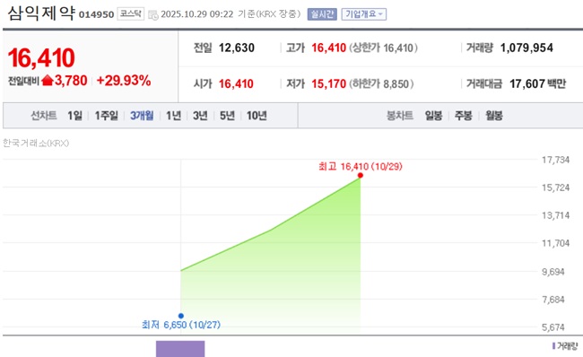 [µ¥Àϸ®ÆÊ=À̼®ÁØ ±âÀÚ] »ïÀÍÁ¦¾àÀÌ ÄÚ½º´Ú ÀÔ¼º ÈÄ 3°Å·¡ÀÏ ¿¬¼Ó »óÇѰ¡´Ù. ½Ã°¡ÃѾ×Àº 1500¾ï¿øÀ» ³Ñ¾î¼¹´Ù.