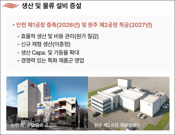 ÀÎõ Á¦1°øÀå ÁõÃà(2026³â), ¿øÁÖ Á¦2°øÀå Âø°ø(2027³â) µîÀÌ´Ù. À̸¦ ÅëÇØ ¡ãÈ¿À²Àû »ý»ê ¹× ºñ¿ë °ü¸®(¿ø°¡ Àý°¨) ¡ã½Å±Ô Á¦Çü »ý»ê(ÀÌÃþÁ¤) ¡ã»ý»ê ÄÉÆÄ ¹× °¡µ¿À² È®´ë ¡ã°æÀï·Â Àִ Ưȭ Á¦Ç°±º ¿µ¾÷¿¡ ³ª¼±´Ù. ½Ã¼³ È®ÃæÀº ÀÚü Çö±Ý°ú »óÀå Á¶´Þ ÀÚ±ÝÀ¸·Î ÅõÀÔÇÒ °èȹÀÌ´Ù.