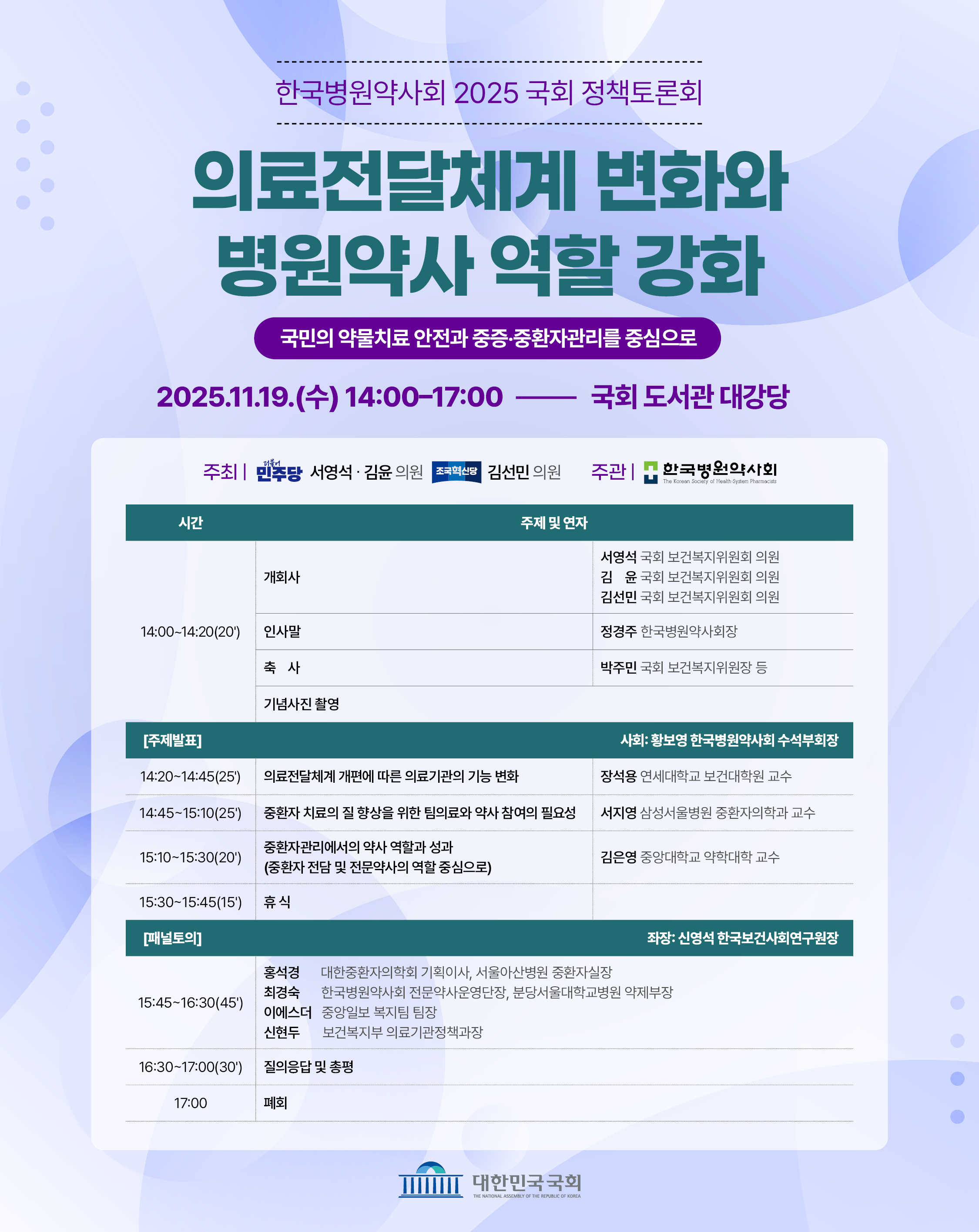 [µ¥Àϸ®ÆÊ=±èÁöÀº ±âÀÚ] Çѱ¹º´¿ø¾à»çȸ(ȸÀå Á¤°æÁÖ)´Â ¿À´Â 11¿ù 19ÀÏ ¿ÀÈÄ 2½Ã ±¹È¸ µµ¼­°ü ´ë°­´ç¿¡¼­ ¡®2025 ±¹È¸ Á¤Ã¥Åä·Ðȸ¡¯¸¦ ÁøÇàÇÑ´Ù.