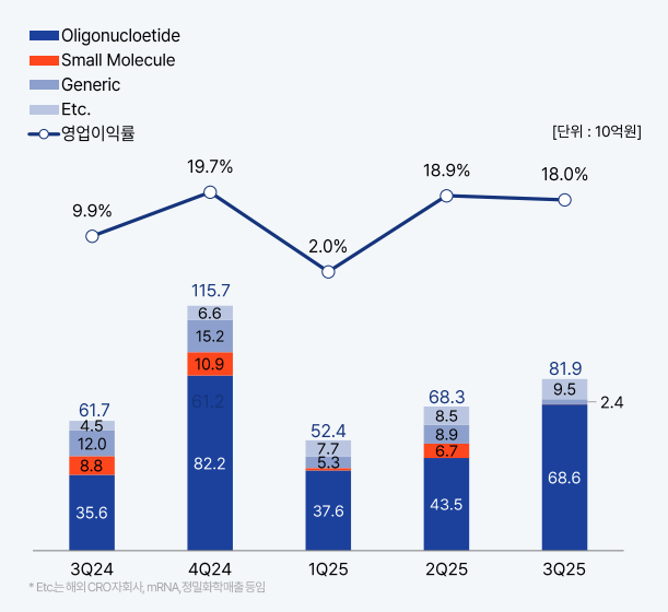 À̹ø ½ÇÀû ¼ºÀåÀ» °ßÀÎÇÑ ÇÙ½ÉÀº ¿Ã¸®°íÇÙ»ê(oligonucleotide) CDMO »ç¾÷ÀÌ´Ù. ÇØ´ç ºÎ¹® ¸ÅÃâÀº 686¾ï¿øÀ¸·Î Àü³â µ¿±â(356¾ï¿ø) ´ëºñ 92.9% ±ÞÁõÇß´Ù. ¼¼ºÎÀûÀ¸·Î ¸¸¼ºBÇü°£¿° Ä¡·áÁ¦ 222¾ï¿ø, Èñ±Í½ÉÇ÷°ü Ä¡·áÁ¦ 256¾ï¿ø, °íÁöÇ÷Áõ 79¾ï¿ø, µ¿¸Æ°æÈ­Áõ 72¾ï¿ø µî ¿Ã¸®°í CDMO Æ÷Æ®Æú¸®¿À°¡ ´Ù¾çÇÑ Áúȯ ¿µ¿ª¿¡ °í¸£°Ô ºÐÆ÷Çß´Ù.