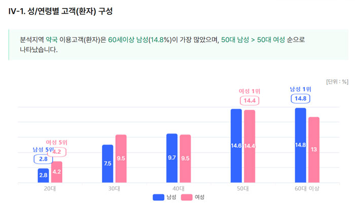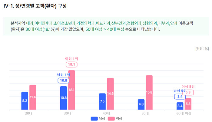 ÀÇ¿ø °í°´(ȯÀÚ)¸¦ ¼ºº°¡¤¿¬·Éº°·Î ±¸ºÐÇÑ °á°ú 30´ë ¿©¼ºÀÌ 18.1%·Î °¡Àå ¸¹¾Ò°í 50´ë ¿©¼º 15.8%, 40´ë ¿©¼º 14.6%, 20´ë ¿©¼º 11.4%, 60´ë ÀÌ»ó ¿©¼º 5.3%·Î Àü ¿¬·É´ë¿¡¼­ ¿©¼º ºñÀ²ÀÌ ³ô°Ô ³ªÅ¸³µ´Ù.
