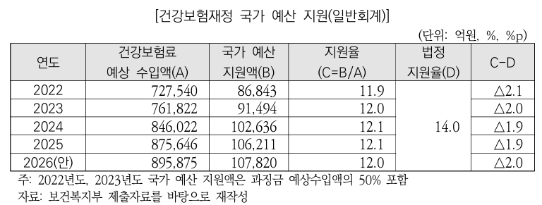 ±¹¹Î°Ç°­º¸Çè¹ý¿¡¼­´Â ¿¹»ó ¼öÀÔ¾×ÀÇ 14%¿¡ »ó´çÇÏ´Â ±Ý¾×À» ±¹°í¿¡¼­ °ø´Ü¿¡ Áö¿øÇϵµ·Ï ±ÔÁ¤Çϰí Àִµ¥, ½ÇÁ¦ Áö¿ø±Ý¾×Àº ÀÌ¿¡ ¹ÌÄ¡Áö ¸øÇϰí ÀÖ´Ù´Â ÁöÀûÀÌ´Ù.