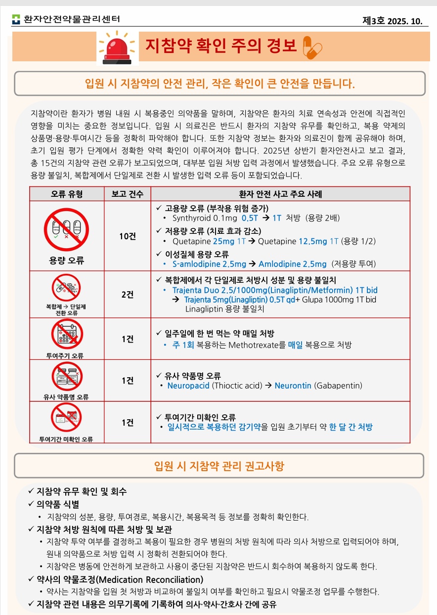 ÇÑÆí À̹ø ¼Ò½ÄÁö ³» ¡®ÁöÂü¾à È®ÀÎ ÁÖÀÇ °æº¸¡¯ Äڳʿ¡¼­´Â 2025³â »ó¹Ý±â ȯÀÚ¾ÈÀü»ç°í º¸°í °á°ú µå·¯³­ ÃÑ 15°ÇÀÇ ÁöÂü¾à °ü·Ã ¿À·ù »ç·Ê°¡ ´ã°å´Ù. ÁÖ·Î ÁöÂü¾àÀ» È®ÀÎÇϰí ÀÔ¿øÃ³¹æÀ¸·Î ÀÔ·Â °úÁ¤¿¡¼­ ó¹æ ºÒÀÏÄ¡ ¿À·ù°¡ ¹ß»ýÇßÀ¸¸ç ÁÖ¿ä ¿À·ù À¯ÇüÀº ¿ë·® ºÒÀÏÄ¡, º¹ÇÕÁ¦¿¡¼­ ´ÜÀÏÁ¦·Î Àüȯ½Ã ºÒÀÏÄ¡ µîÀ̾ú´Ù. ±Ç°í»çÇ×À¸·Î´Â ¡ãÁöÂü¾à À¯¹« È®ÀÎ ¹× ȸ¼ö ¡ãÀǾàǰ ½Äº° ¡ãÁöÂü¾à ó¹æ ¿øÄ¢¿¡ µû¸¥ ó¹æ ¹× º¸°ü ¡ã¾à»çÀÇ ¾à¹°Á¶Á¤ µîÀÌ Á¦½ÃµÆ´Ù.