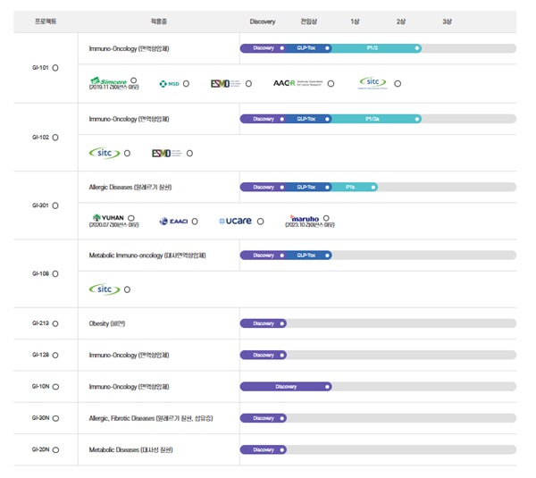 Áö¾ÆÀÌÀ̳뺣À̼ÇÀº È®ÃæÇÑ Àç¿øÀ» ¹ÙÅÁÀ¸·Î ÇÙ½É ÆÄÀÌÇÁ¶óÀÎ °³¹ß°ú ±Û·Î¹ú ÀÓ»ó ÃßÁø¿¡ ¼Óµµ¸¦ ³¾ °ÍÀ¸·Î º¸ÀδÙ. Áö¾ÆÀÌÀ̳뺣À̼ÇÀº ¡ã¸é¿ªÇ×¾ÏÁ¦ 'GI-101'°ú 'GI-102' ¡ã¾Ë·¹¸£±â Ä¡·áÁ¦ 'GI-301' ¡ãÁ¤¸ÆÁÖ»çÁ¦Çü ¸é¿ªÇ×¾ÏÁ¦ 'GI-108'¿¡ µîÀ» ÇÙ½É ÆÄÀÌÇÁ¶óÀÎÀ¸·Î ²Å°í À̵é ÁÖ¿ä °úÁ¦¿¡ ¿¬±¸°³¹ß ÀÚ¿øÀ» ÁýÁßÇÏ´Â '¼±Åðú ÁýÁß' Àü·«À» ÃßÁøÇϰí ÀÖ´Ù.