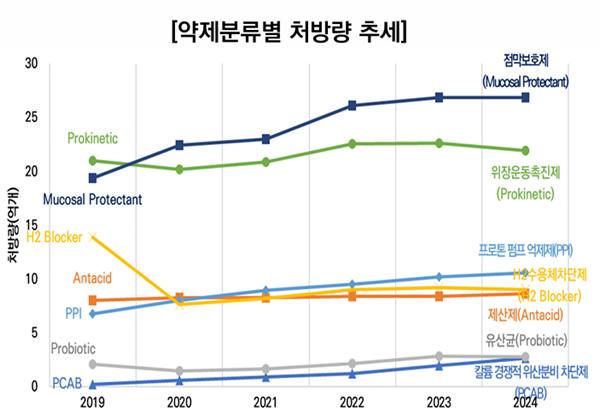 2019³âºÎÅÍ 2024³â±îÁö PPI(ÇÁ·ÎÅæÆßÇÁ¾ïÁ¦Á¦)¿Í P-CAB(Ä®·ý °æÀïÀû À§»êºÐºñ Â÷´ÜÁ¦)ÀÇ Ã³¹æ·®ÀÌ Å©°Ô »ó½ÂÇß´Ù. PPI´Â 39.3%, P-CABÀº 802.2%°¡ ´Ã¾î³µ´Ù.