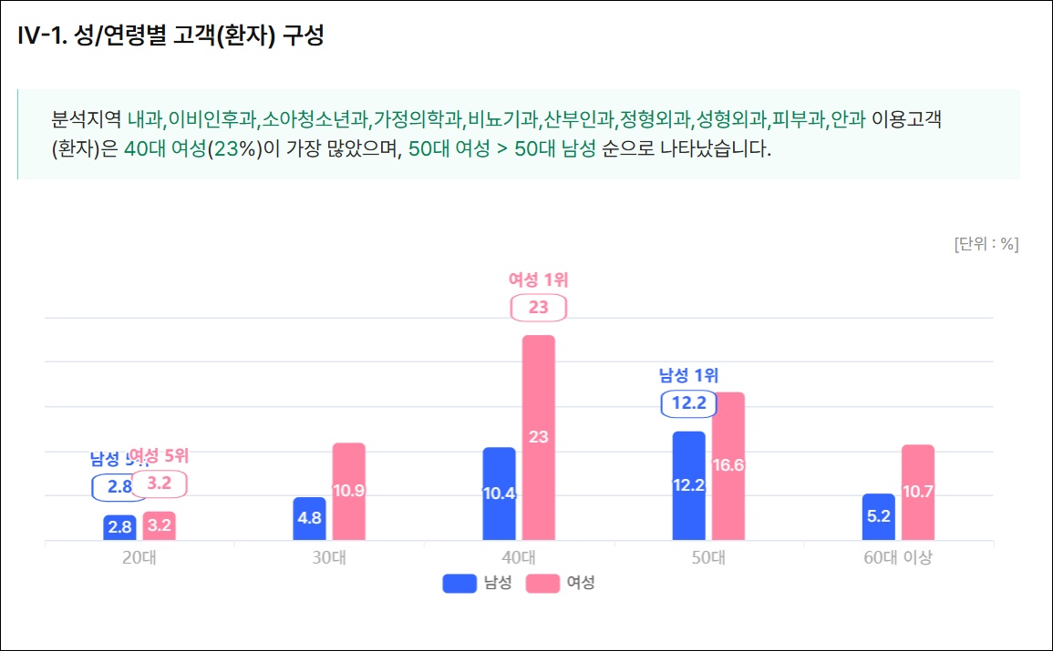 ÀÇ¿ø °í°´(ȯÀÚ)¸¦ ¼ºº°¡¤¿¬·Éº°·Î ±¸ºÐÇÑ °á°ú 40´ë ¿©¼ºÀÌ 23%·Î °¡Àå ¸¹¾Ò°í, 50´ë ¿©¼º 16.6%, 50´ë ³²¼º 12.2%, 30´ë ¿©¼º 10.9%, 60´ë ÀÌ»ó ¿©¼º 10.7%, 40´ë ³²¼º 10.4% ¼øÀ¸·Î Àü ¿¬·É´ë¿¡¼­ ¿©¼º ºñÀ²ÀÌ ³ô°Ô ³ªÅ¸³µ´Ù.