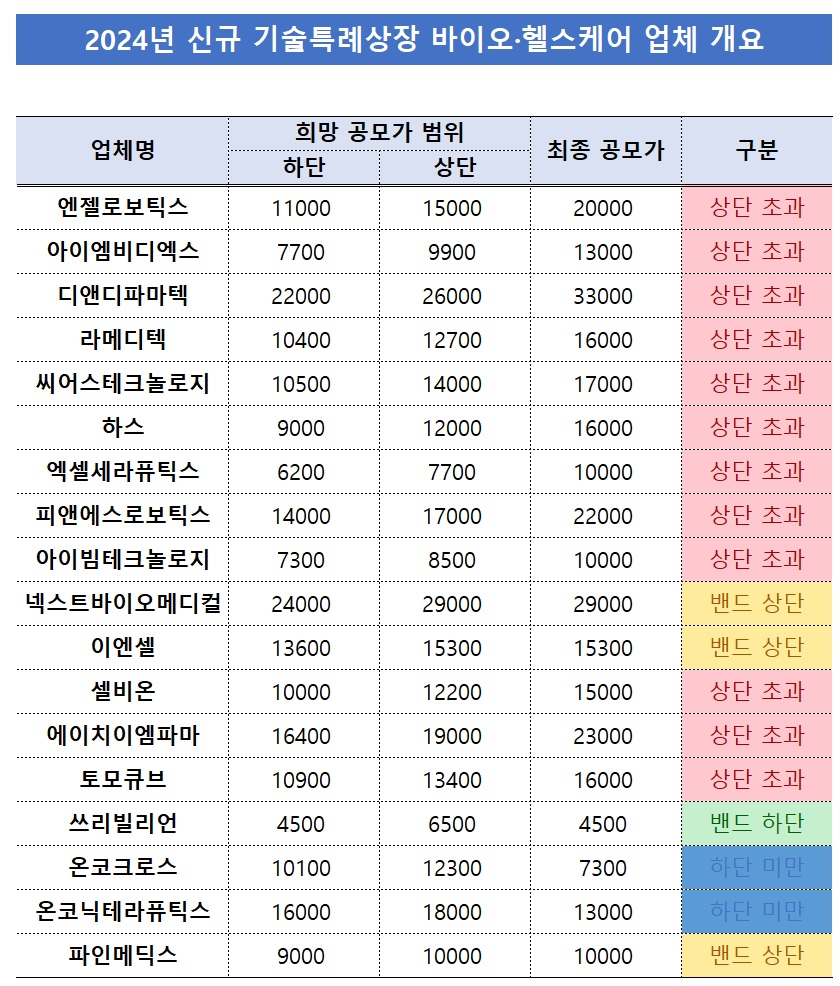 Áö³­ÇØ ±â¼úƯ·Ê Á¦µµ·Î ÄÚ½º´Ú¿¡ ÁøÀÔÇÑ ±â¾÷Àº ÃÑ 18°÷ÀÌ´Ù. ÀÌµé ±â¾÷ Áß ¹êµå »ó´ÜÀ» ³Ñ¾î ÃÖÁ¾ °ø¸ð°¡¸¦ È®Á¤ÇÑ °÷Àº 12°÷ÀÌ´Ù. À۳⠱â¼úƯ·Ê·Î »óÀåÇÑ ¹ÙÀÌ¿À¡¤ÇコÄÉ¾î ±â¾÷ÀÇ ¾à 67%°¡ Èñ¸Á °ø¸ð°¡ ¹üÀ§¸¦ ÃʰúÇÑ °¡°Ý¿¡ ÃÖÁ¾ °ø¸ð°¡¸¦ °áÁ¤Çß´Ù´Â ¾ê±â´Ù. ÀÌ¿Ü ¹êµå »ó´Ü¿¡¼­ °ø¸ð°¡¸¦ È®Á¤ÇÑ ±â¾÷ÀÌ 3°÷, ¹êµå ÇÏ´ÜÀÌ 1°÷, ÇÏ´Ü ¹Ì´ÞÀÌ 2°÷À¸·Î ³ªÅ¸³µ´Ù.