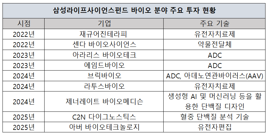 [µ¥Àϸ®ÆÊ=ÃÖ´ÙÀº ±âÀÚ] »ï¼º±×·ìÀÌ ¿î¿µÇÏ´Â ¹ÙÀÌ¿À ÅõÀÚ ÆÝµå°¡ ±â¼úº° ÅõÀÚ ¿µ¿ªÀ» ´Ù°¢È­Çϰí ÀÖ´Ù. Ãâ¹ü Ãʱâ À¯ÀüÀÚ Ä¡·áÁ¦¸¦ ºñ·ÔÇØ ADC(Ç×ü¾à¹°Á¢ÇÕü) Ç×¾ÏÁ¦, AI ½Å¾à °³¹ß, À¯ÀüÀÚ ÆíÁý ±â¼ú µî ½ÃÀåÀÇ R&D Æ®·»µå¿¡ ¸ÂÃá ¼ºÀå ¿£ÁøÀ» È®º¸Çϰڴٴ ¸ñÇ¥´Ù. ¾÷°è´Â »ï¼ºÀÇ ¹ÙÀÌ¿À ½Å±â¼ú ÅõÀÚ Çຸ¿Í Çù·Â ÆÄÆ®³Ê»ç¿¡ ÁÖ¸ñÇϰí ÀÖ´Ù.