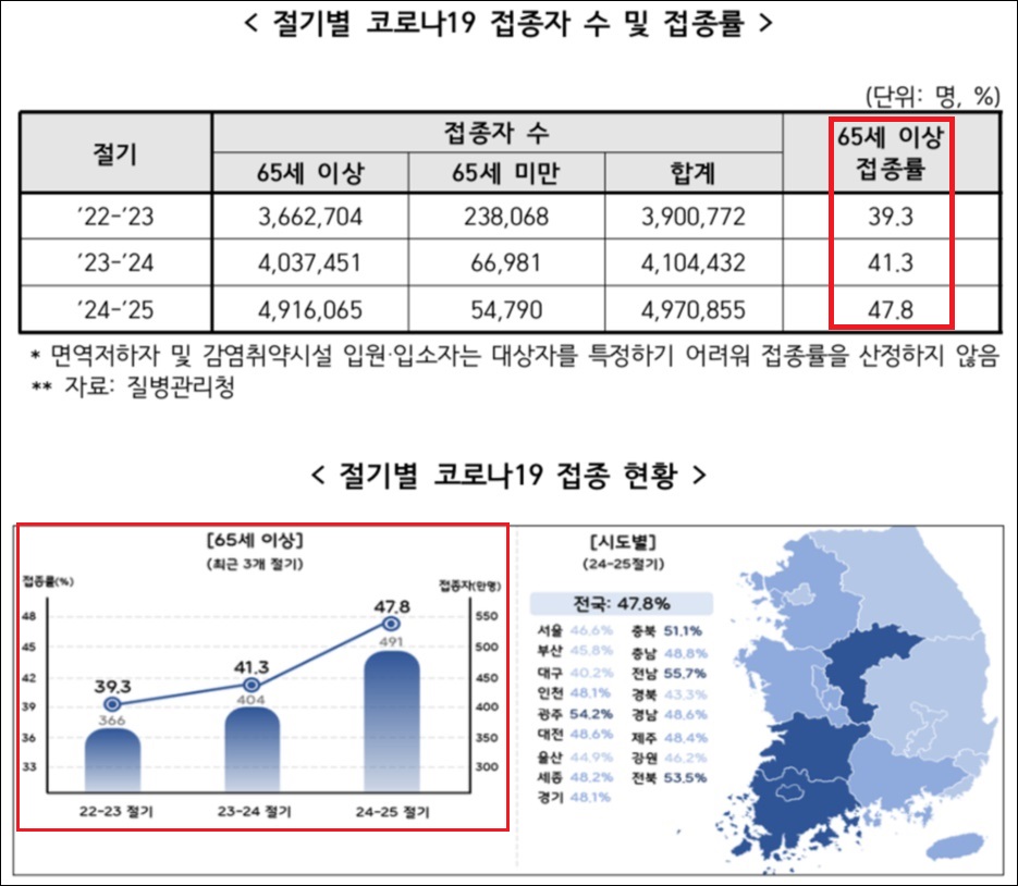 Áúº´Ã»Àº 2026³âµµ NIP ¿¹»êÀ» 42%·Î »êÁ¤ÇØ Æí¼ºÇߴµ¥, Àý±âº° Äڷγª19 ¹é½Å Á¢Á¾ÀÚ ¼ö¿Í Á¢Á¾·ü(65¼¼ ÀÌ»ó)À» º¸¸é 2022~2023Àý±â´Â 290¸¸¸íÀÎ 39.3%, 2023~2024Àý±â´Â 410¸¸¸íÀÎ 41.3%, 2024~2025Àý±â´Â 497¸¸¸íÀ¸·Î 47.8%·Î Áý°èµÅ¸ç Áõ°¡¼¼¸¦ À̾°í ÀÖ´Ù.