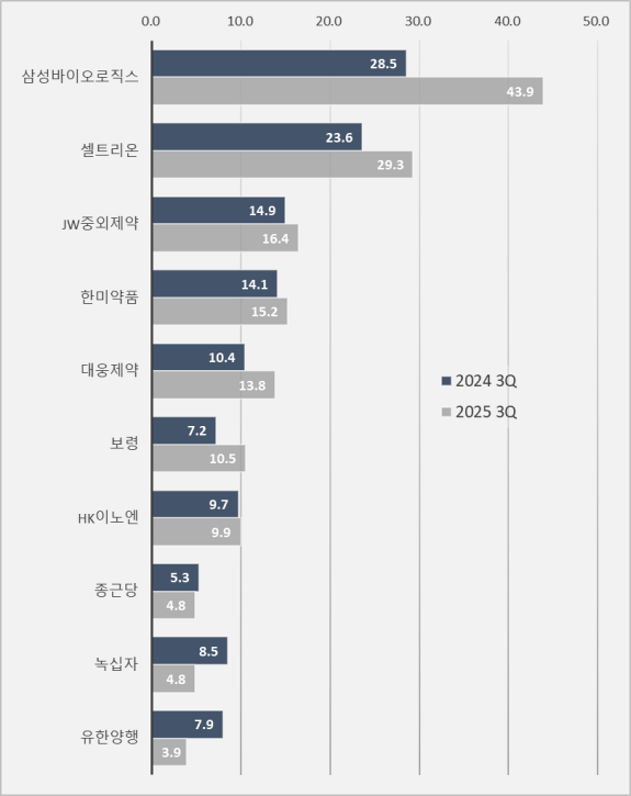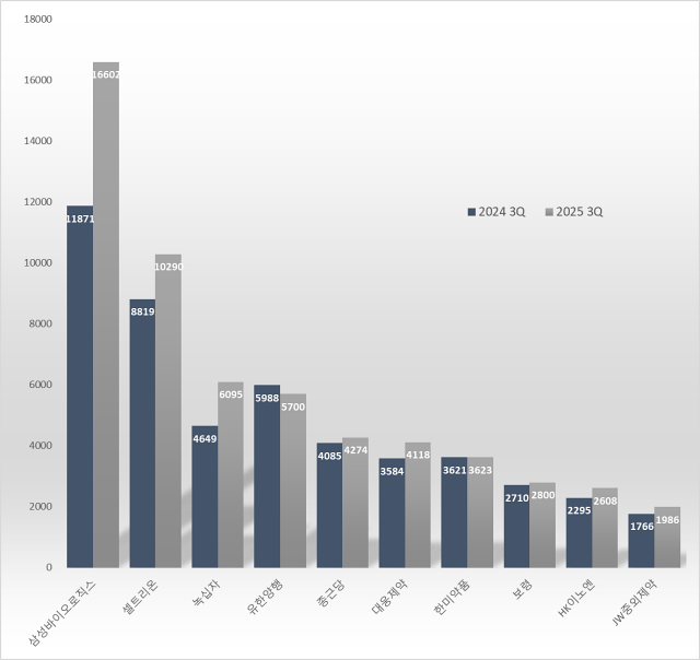 10ÀÏ ±ÝÀ¶°¨µ¶¿ø¿¡ µû¸£¸é ÁÖ¿ä ´ëÇü Á¦¾à¹ÙÀÌ¿À±â¾÷ 10°÷ Áß 9°÷ÀÇ 3ºÐ±â ¸ÅÃâÀÌ Àü³â µ¿±â´ëºñ Áõ°¡Çß´Ù. »ï¼º¹ÙÀÌ¿À·ÎÁ÷½º, ¼¿Æ®¸®¿Â, ³ì½ÊÀÚ, À¯ÇѾçÇà, Á¾±Ù´ç, ´ë¿õÁ¦¾à, Çѹ̾àǰ, º¸·É, HKÀ̳뿣, JWÁß¿ÜÁ¦¾à µî ÀáÁ¤ ½ÇÀûÀ» ¹ßÇ¥ÇÑ »óÀå ´ëÇü Á¦¾à¹ÙÀÌ¿À±â¾÷ 10°÷À» ´ë»óÀ¸·Î Áý°èÇß´Ù. ´ëÇü Á¦¾à¹ÙÀÌ¿À±â¾÷ 10°÷ Áß 7°÷ÀÇ ¿µ¾÷ÀÌÀÍÀÌ À۳⺸´Ù È®´ëµÆ´Ù.