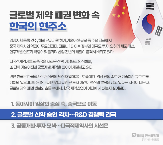 Áß±¹ Ç×¾ÏÁ¦°¡ ÀÕµû¶ó ¹Ì±¹ FDAÀÇ ¹®ÅÎÀ» ³Ñ´Â °¡¿îµ¥, ¾÷°è¿¡¼­´Â ¾ç±¹ÀÇ ±ÔÁ¦¡¤Æò°¡ ü°è Â÷À̰¡ °á±¹ ½Å¾à ¼º°úÀÇ °ÝÂ÷·Î À̾îÁ³´Ù´Â ÁöÀûÀÌ ³ª¿Â´Ù. Áß±¹ÀÌ Áö³­ 10³â°£ Çõ½ÅÀûÀ¸·Î ±ÔÁ¦¸¦ °³ÆíÇϸç FDAÇü R&D ½Ã½ºÅÛÀ» ±¸ÃàÇÑ ¹Ý¸é, Çѱ¹Àº ¿©ÀüÈ÷ ÀýÂ÷ Á߽ɡ¤º¸¼öÀû ½Ã½ºÅÛ¿¡¼­ ¹þ¾î³ªÁö ¸øÇϰí ÀÖ´Ù´Â °ÍÀÌ´Ù.