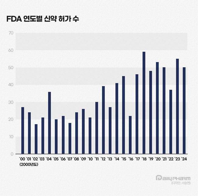 ÃÖ±Ù µé¾î FDA´Â ½Å¾à Çã°¡ ¼ö ÀÚü¸¦ ÁÙÀÌ´Â ±âÁ¶¸¦ º¸À̰í ÀÖ´Ù. Áö³­ÇØ FDAÀÇ ½Å¾à ½ÂÀÎ °Ç¼ö´Â 50°ÇÀ¸·Î Àü³â ´ëºñ 3°Ç °¨¼ÒÇß´Ù.