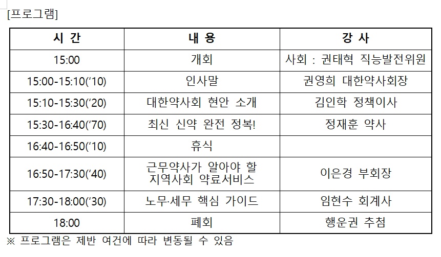 ÇÁ·Î±×·¥Àº ¡ã´ëÇѾà»çȸ Çö¾È ¼Ò°³(±èÀÎÇÐ Á¤Ã¥ÀÌ»ç) ¡ãÃֽŠ½Å¾à ¿ÏÀü Á¤º¹(Á¤ÀçÈÆ ¾à»ç) ¡ã±Ù¹«¾à»ç°¡ ¾Ë¾Æ¾ß ÇÒ Áö¿ª»çȸ ¾à·á¼­ºñ½º(ÀÌÀº°æ ºÎȸÀå) ¡ã±Ù¹«¾à»ç¸¦ À§ÇÑ ³ë¹«¡¤¼¼¹« ÇÙ½É °¡À̵å(ÀÓÇö¼ö ÆÊÅØ½º ȸ°è»ç) ÄÜÅÙÃ÷ µîÀ¸·Î ±¸¼ºµÆ´Ù.