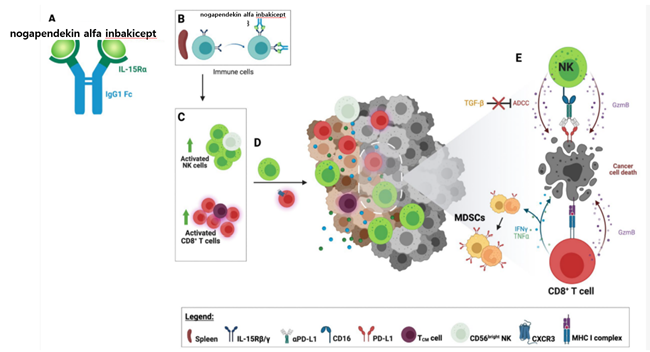 ³ë°¡Ææµ¥Å² ¾ËÆÄ ÀιÙŰ¼ÁÆ®´Â IL-15 µ¹¿¬º¯ÀÌü(IL-15N72D)¿Í IL-15R¥á¸¦ À¶ÇÕÇÑ º¹ÇÕü·Î, ÀÚ¿¬ ¸é¿ª¼¼Æ÷°¡ Á¦°øÇÏ´Â IL-15 Á¦½Ã ±âÀüÀ» ¸ð¹æÇÑ´Ù. À̸¦ ÅëÇØ CD8+ T ¼¼Æ÷, NK ¼¼Æ÷, ±â¾ï T ¼¼Æ÷ÀÇ Áõ½Ä¡¤È°¼ºÈ¸¦ °ÇÏ°Ô À¯µµÇϸ鼵µ, ¸é¿ª¾ïÁ¦¼º Á¶Àý T ¼¼Æ÷ÀÇ È®ÀåÀº ÃÖ¼ÒÈÇÑ´Ù.